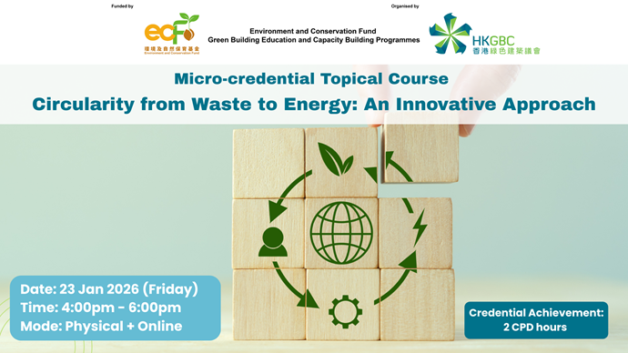 Funded by the Environment and Conservation Fund and organised by the Hong Kong Green Building Council (HKGBC), this micro-credential topical course series is designed to provide participants with more in-depth continuing education than traditional CPD webinars. It enables practitioners to construct weekend or after-hours study programmes that meet their development needs. Courses will be rolled out at a frequency of about 1-2 courses per month, throughout a period of two years from 1 September 2025 to 31 August 2027. Participants taking 20 or more courses can apply for a skill enhancement certificate from HKGBC, certifying their significant efforts in studying green building.