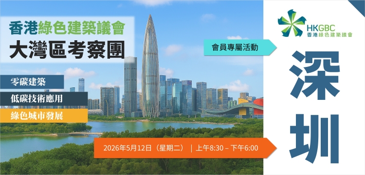 香港綠色建築議會(HKGBC)將於 2026 年 5 月 12 日 舉辦會員專屬活動「大灣區考察團——深圳」,為期一天,透過實地參觀深圳的綠色建築項目及與當地專業機構交流,促進會員與大灣區業界之間的互動與合作。