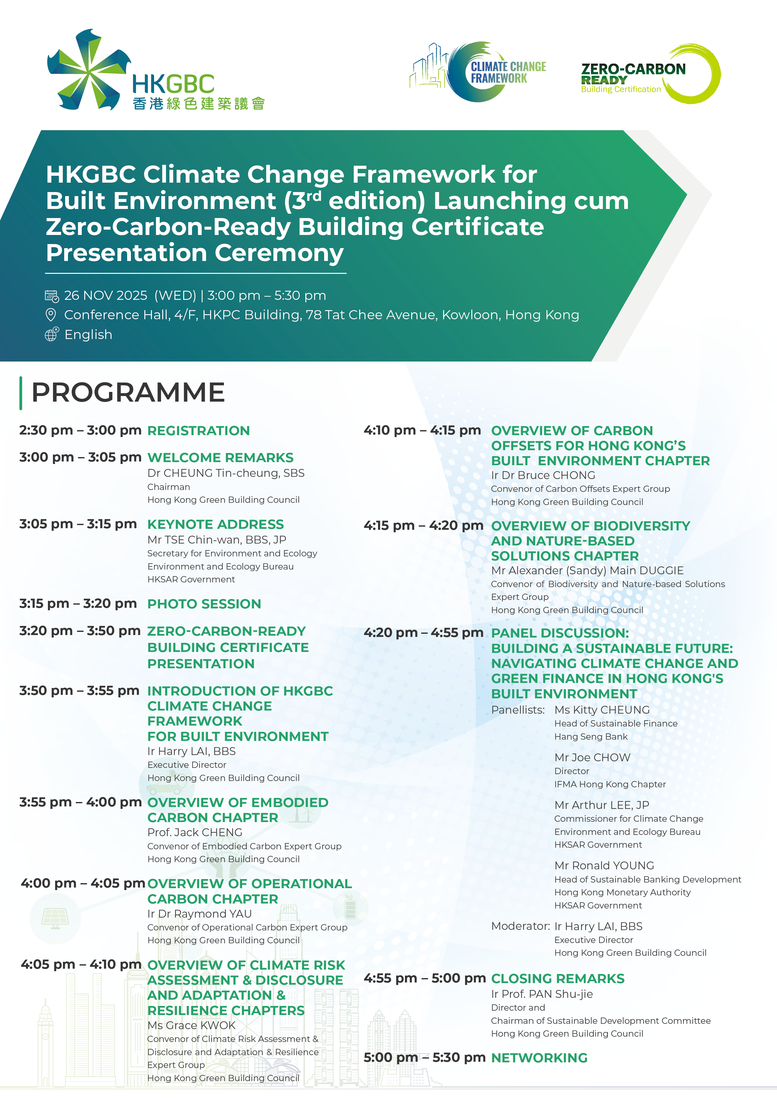 Hong Kong’s Climate Action Plan 2050 has set a pathway for achieving carbon neutrality in Hong Kong before 2050, and it highlights the critical role of the building sector in reducing carbon emissions. The Hong Kong Green Building Council (HKGBC) is taking the lead - together with relevant experts and stakeholders of the building industry, in developing the HKGBC Climate Change Framework for Built Environment and Zero-Carbon-Ready Building Certification Scheme. The event aims to announce the launch of the Framework’s 3rd edition, and to recognise buildings obtaining the Zero-Carbon-Ready Building certificates in the year of 2025.