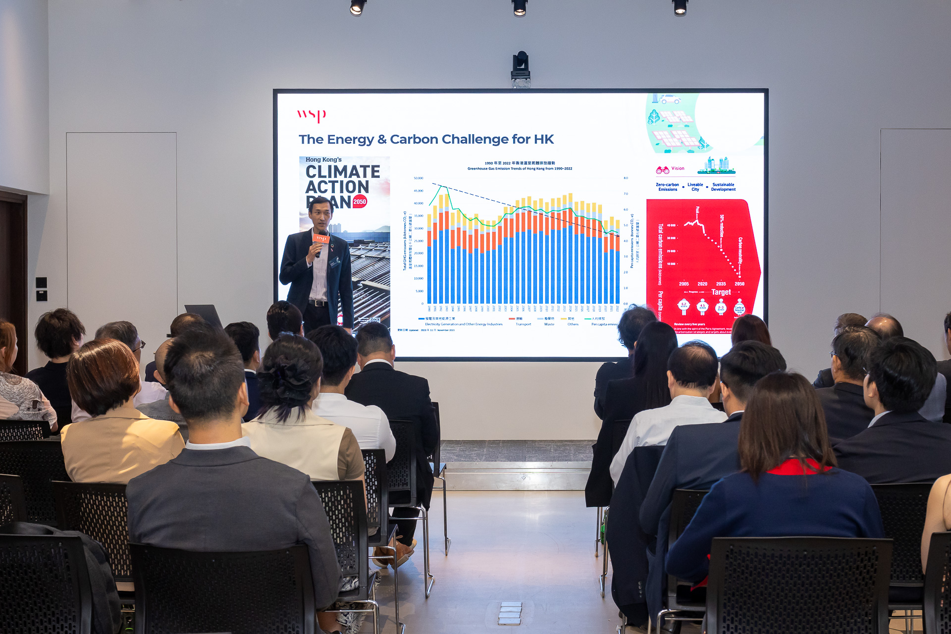 The invaluable perspective of guest speakers further enriched the seminar— Ms Emily LI from Nam Fung Group and Mr Angus CHOI from KPMG China. They both discussed creating sustainable workplaces and exploring innovative business models that support green building projects utilising sustainable energy. Their insights complemented WSP’s vision, reinforcing the importance of collaboration within the industry to achieve shared sustainability objectives.