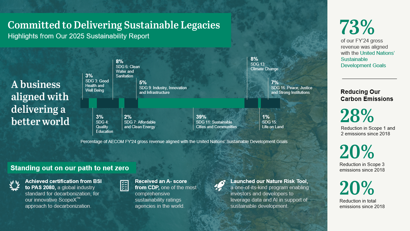 Around the world, demand for sustainability and resilience has never been greater. The effects of worsening impacts from extreme climate events and increasing recognition of societal challenges compel everyone to act. AECOM’s 2025 Sustainability Report reaffirms the Company’s commitment to delivering a better world, highlights the progress made toward ambitious goals, and celebrates key accomplishments.