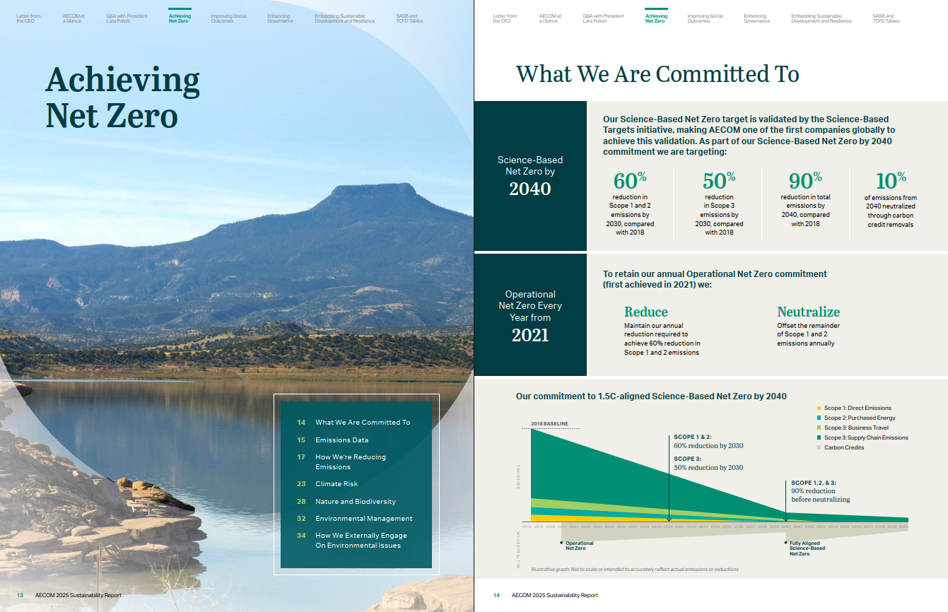 - Set net-zero emissions targets approved by the Science Based Targets initiative (SBTi), placing AECOM among the first companies globally to receive such validation
