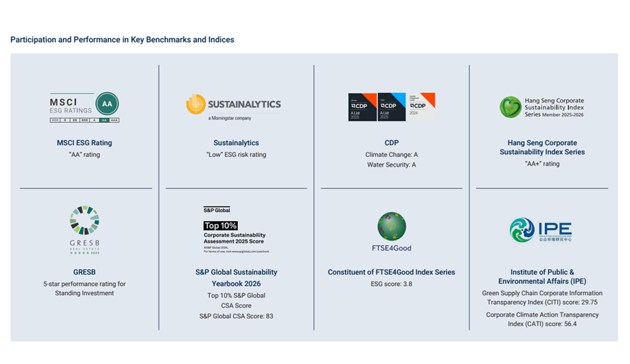 - 100% of Hong Kong and Mainland properties and projects completed climate adaptation technical analysis