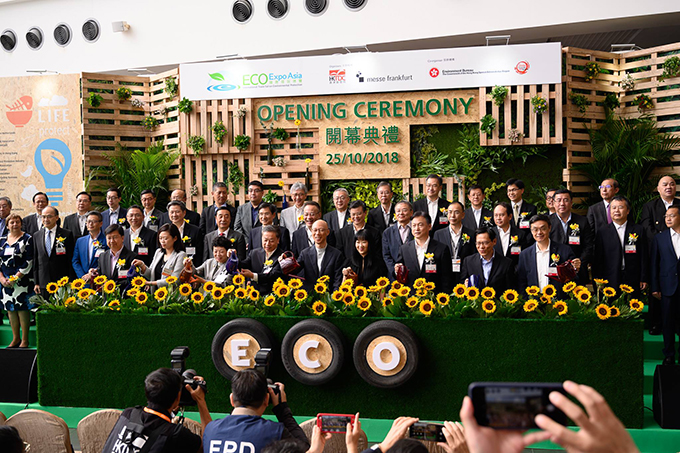 Mr Wong Kam-sing, Secretary for the Environment, is joined by Ir Cary Chan Wing-hong, Executive Director of the HKGBC, and other guests to kick-start the expo at the Opening Ceremony.