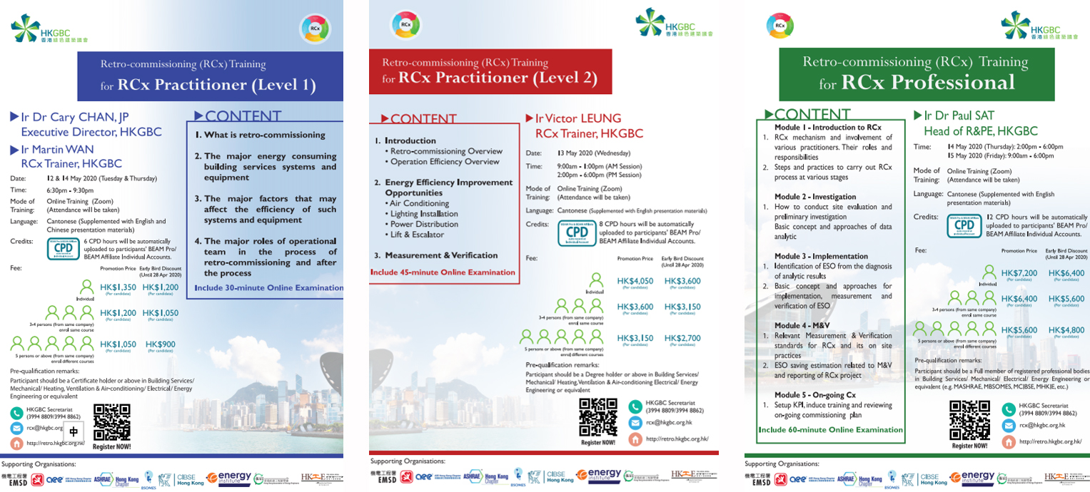 With the official launch of the RCx Training and Registration Scheme in November last year, the Hong Kong Green Building Council has organised a number of RCx trainings which are designed to elevate the skill levels of RCx professionals. Upon completing the training and passing the examination, the potential applicant is eligible to apply for the registration of RCx Practitioner (Level 1), RCx Practitioner (Level 2) and/or RCx Professional with the fulfilment of the corresponding requirements.