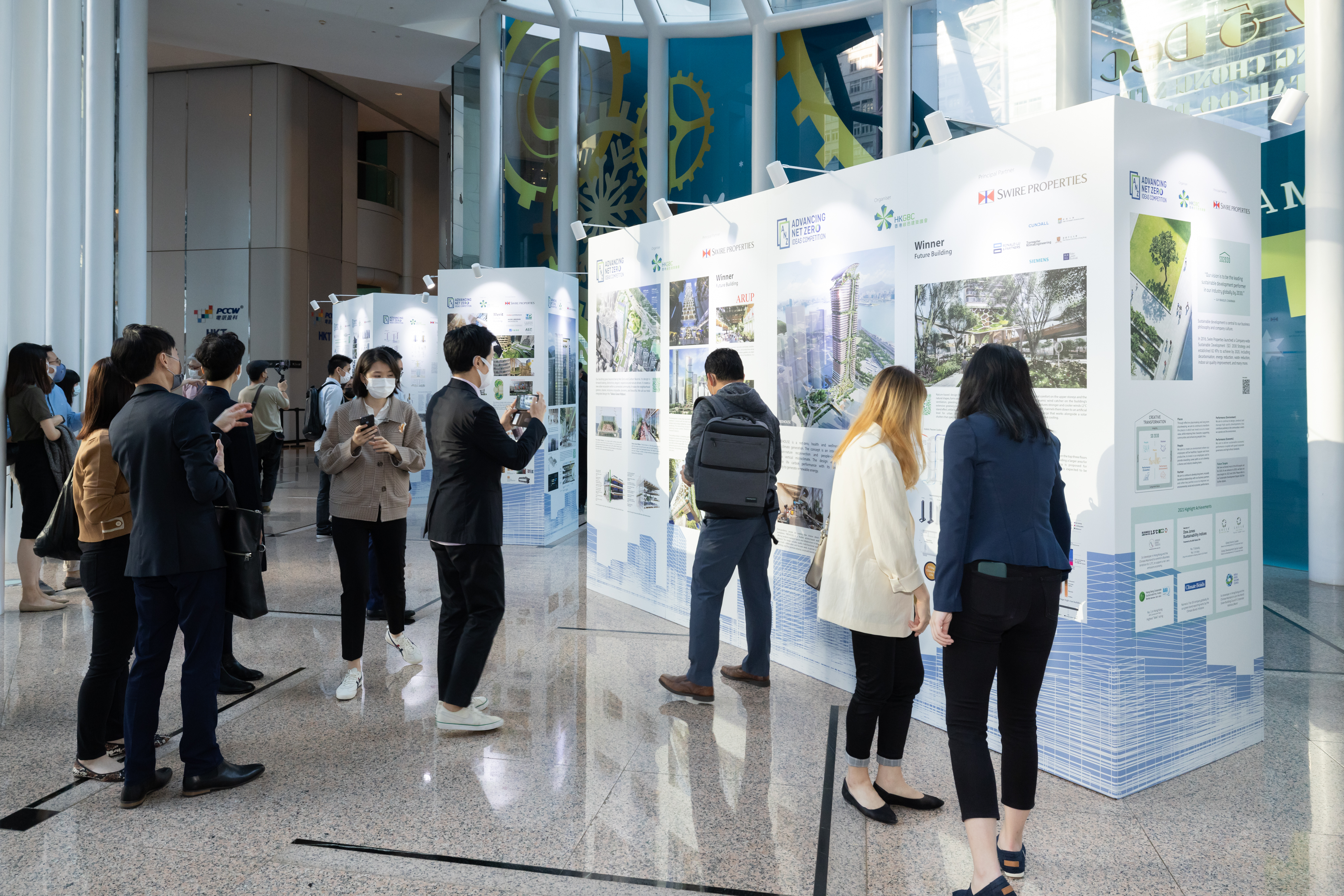 To help encourage a transformation in the market, not only will all the valuable and pioneering solutions from the winners and merits be published in an e-book hosted on HKGBC’s website but also showcased via a series of public exhibition. The first exhibition which commenced on 29 Novemner at Linkbridge, Lincoln House, Taikoo Place (between 29 November – 17 December) , was witnessed by Mr CHEUNG Hau-wai, Chairman of HKGBC, Mrs Elizabeth KOK, Director and Senior Advisor of Swire Properties, Ar. Prof. Ada FUNG, Chairperson of the Organising Committee of the Competition and the guests.