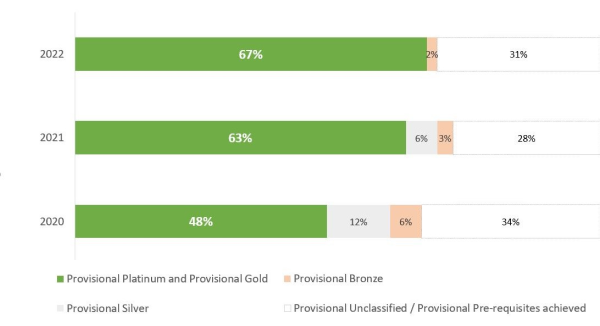 The Hong Kong Green Building Council (HKGBC) has continually analysed the grading distribution of BEAM Plus results over the years. Initially, the percentage of projects obtaining a Gold rating or above stood at about 40%. In recent years, however, this has risen to more than 60% (see Figure 1). Regarding the credit achievement rates among the latest BEAM Plus New Buildings (v2.0) projects, the following credits are found to have particularly high achievement rates: