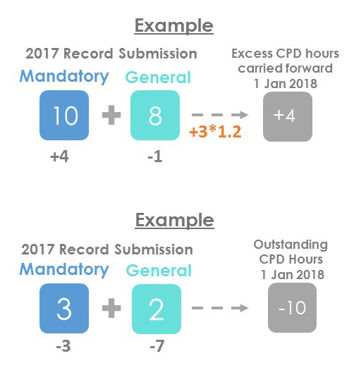 To recognise your efforts in attending the Mandatory CPD events, your net of excess Mandatory CPD hours (after covering the outstanding General CPD hours) will be multiplied by 1.2 then carried forward to 2018. Some examples are illustrated at right.