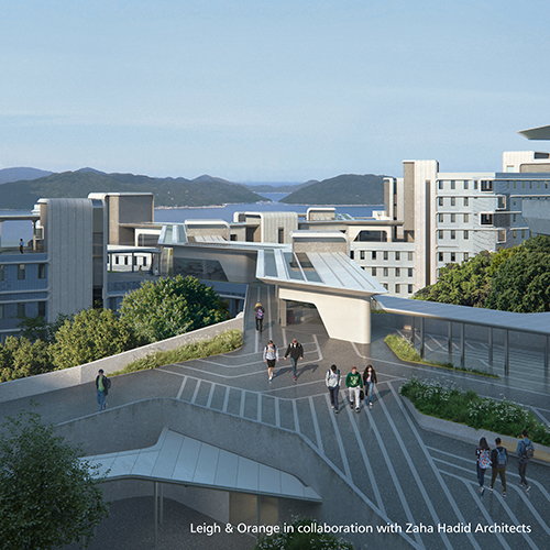 The Jockey Club i-Village by Hong Kong University of Science and Technology and Leigh & Orange Ltd, has been designed to the highest sustainability standards through the use of highly adaptive sustainable and smart technology, providing an environmentally friendly and smart campus development. Due to its location on a sloping site, the roof line has been strategically developed into a socially animated circulation thoroughfare to create spontaneous communal interaction and connect the academic blocks in the north with the residences in the south.