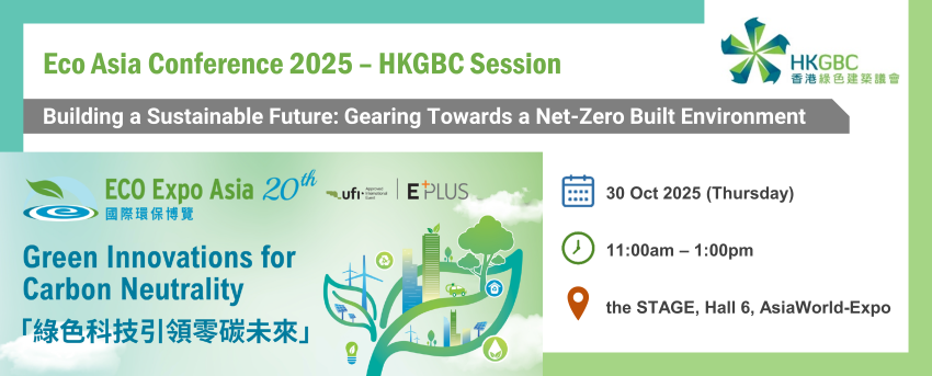 Join the Hong Kong Green Building Council (HKGBC) at the Eco Asia Conference 2025 for the session themed “Building a Sustainable Future: Gearing Towards a Net-Zero Built Environment” on 30 Oct 2025 (Thu) at the AsiaWorld-Expo!