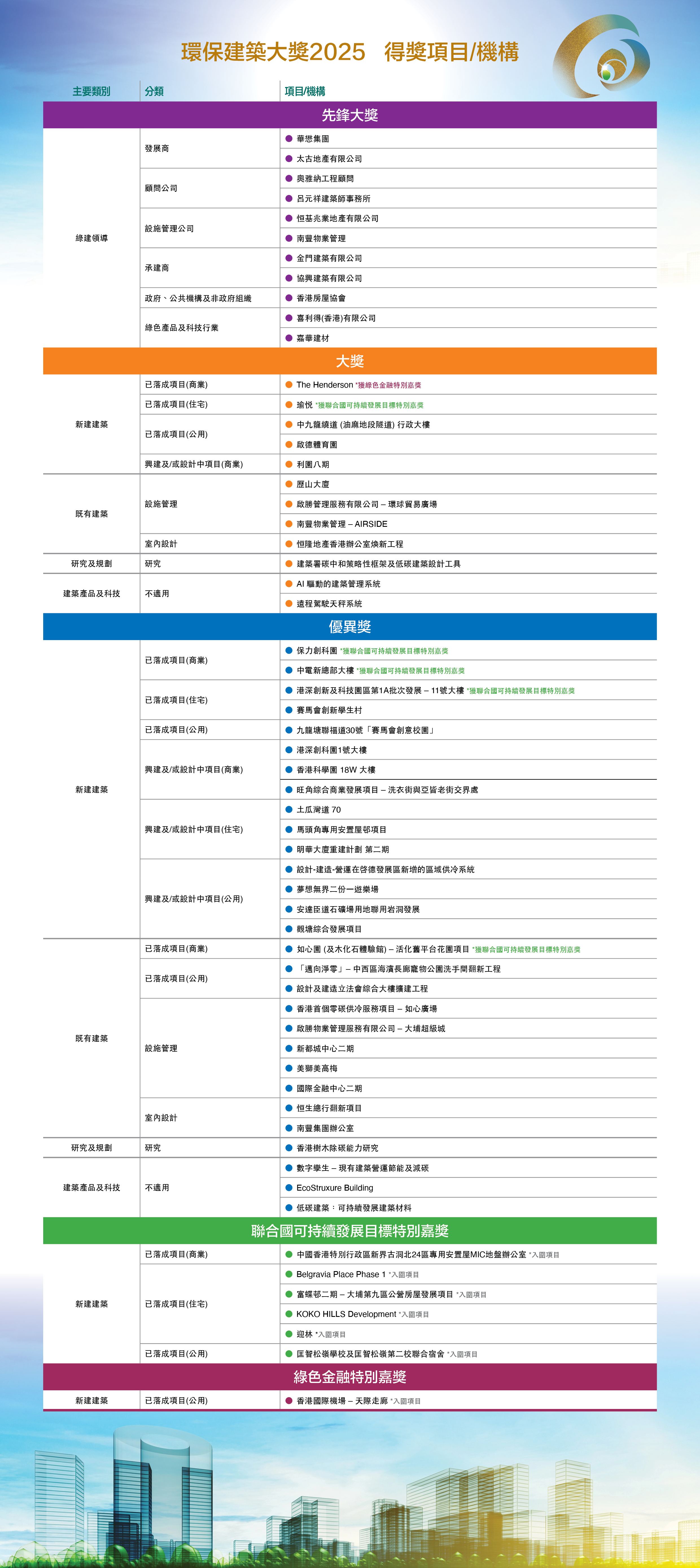 「環保建築大獎2025」各類別的獲獎項目及機構名單如下,包括先鋒大奬、大獎、優異獎、「聯合國可持續發展目標特別嘉獎」及「綠色金融特別嘉獎」: