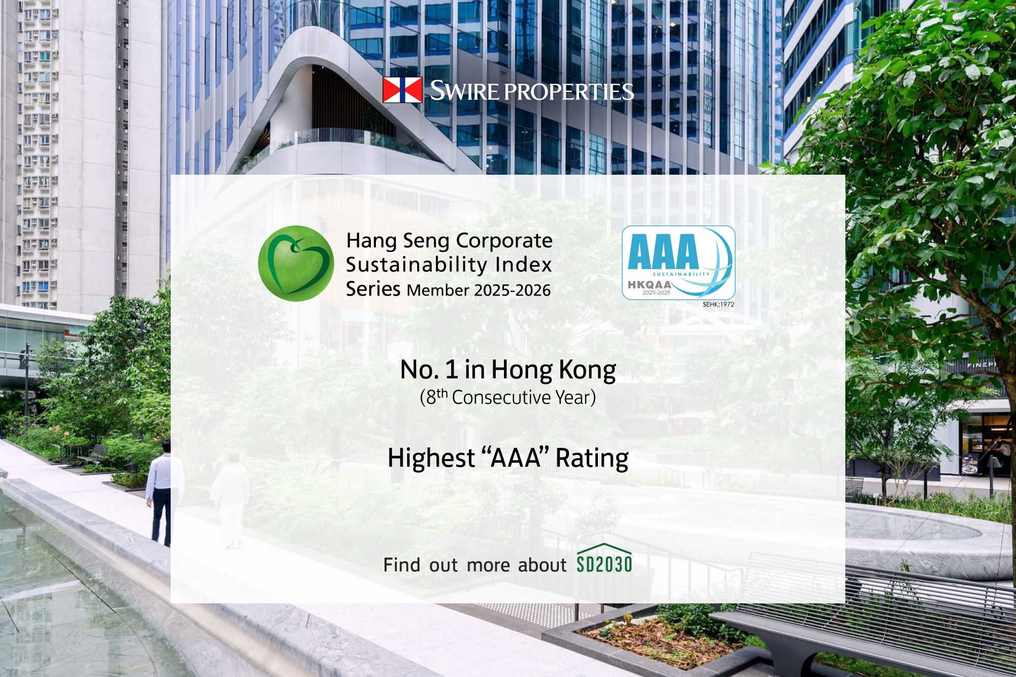 在香港,太古地產連續第八年於恒生可持續發展企業指數中高踞首位,並保持最高「AAA」評級,在500間合資格香港上市公司中獲得最高總體評分。同時,公司亦連續第六年入選恒生ESG 50指數,嘉許市值較高且ESG表現卓越的上市企業。